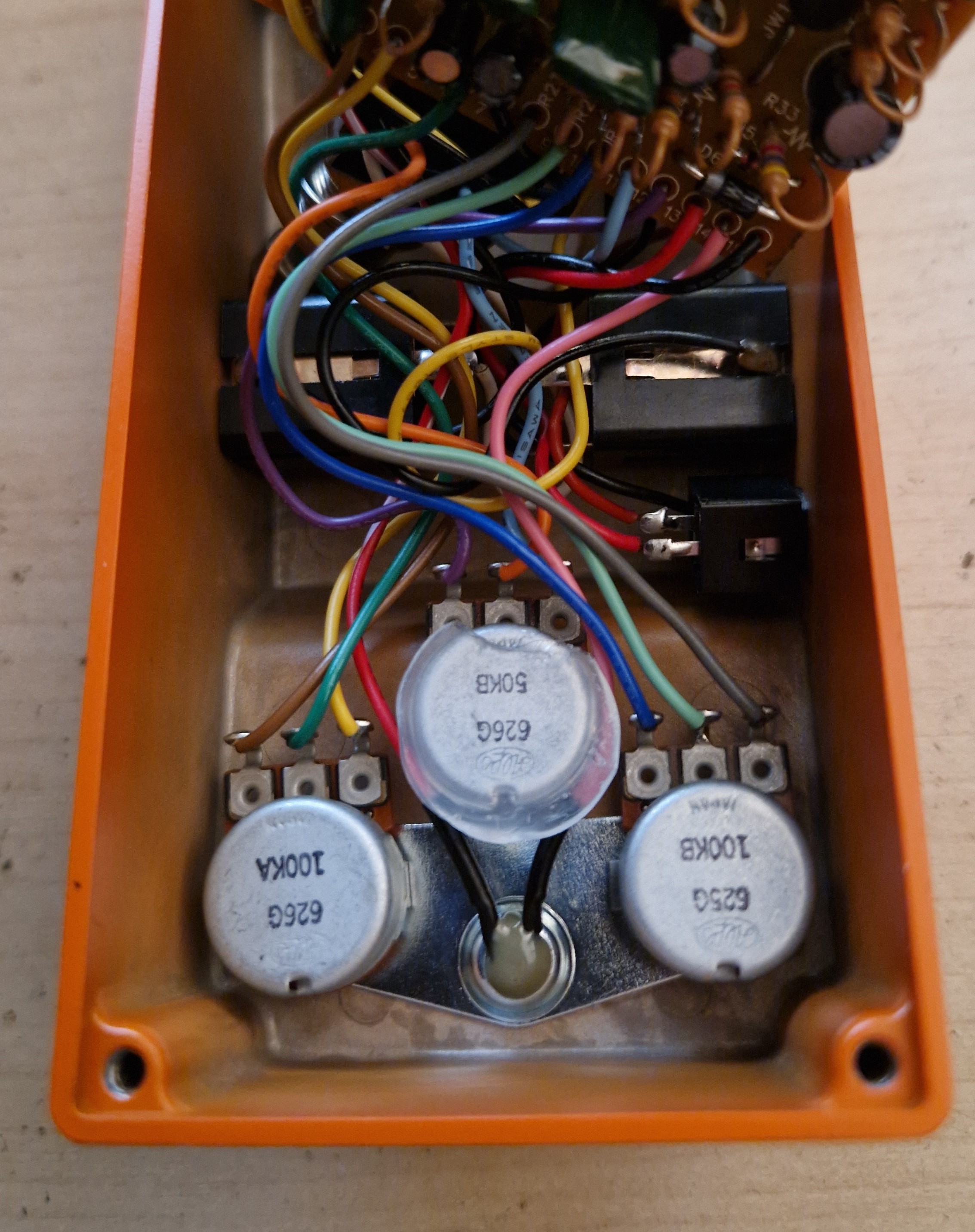 I got a hold of the original version a while ago. In the proces of writing this piece a second one came in for some TLC and a DC jack. Opening up the unit you can spot the little plastic enclosure in which the PCB is housed. Both use the same sort of components and design. Both vintage pedals had their switches replaced with a DPDT switch. The orginal pedal used a SPDT switch and was not true bypass. The vintage pedals could only be powered by a battery but usually people later added a DC jack. No LED is in these pedals to see if the pedal is turned on or off.